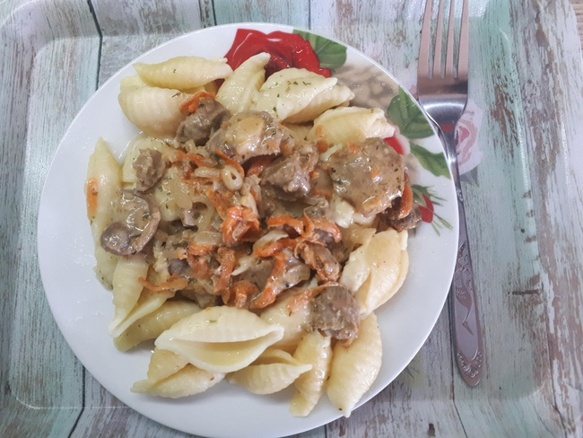 Здравствуйте, мои дорогие! Сегодня я хочу показать вам рецепт приготовления куриных желудков. Желудки получаются очень мягкие и очень вкусные. Сначала нам нужно порезать желудки на небольшие кусочки. Потом кладём их в чашку. Заливаем водой. Хорошо промываем. Затем выкладываем их в сковороду, заливаем водой (300-400 мл) и варим под крышкой на медленном огне до полного испарения жидкости . Когда вода испарится, наливаем масло, кладём лук, морковь и обжариваем до готовности лука и моркови. Затем добавляем смешанную с томатной пастой или кетчупом сметану, перемешиваем. Накрываем крышкой и тушим на малом огне 15-20 минут. Потом кладём смесь душистых трав, любую приправу. И ещё томим под крышкой минут 5.Добавляем воду ( 300 мл), даём закипеть и на малом огне кипятим минут 15 - 20. Я всегда пробую в конце, если желудки уже мягкие, то выключаю и оставляю под крышкой минут на 5. И вот вкусные куриные желудочки в сметанно - томатном соусе готовы . Вот то что нам необходимо для приготовления: К