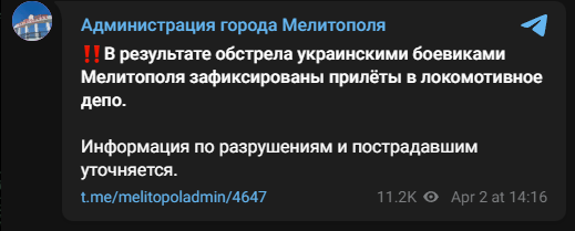 Украинские войска обстреляли в воскресенье Мелитополь, есть попадания по локомотивному депо, сообщила администрация города. Информация по разрушениям и пострадавшим уточняется, отметили власти.