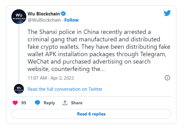 Полиция Шаньси в Китае арестовала преступную группировку, причастную к производству и распространению поддельных криптовалютных кошельков. Банда распространяла установочные пакеты поддельного кошелька Android Package kit (APK) через популярные приложения для обмена сообщениями. Банды заманивали жертв с помощью социальных сетей Банда распространяла установочные пакеты APK поддельного кошелька через известные приложения для обмена сообщениями, такие как WeChat и Telegram, и покупала рекламу в поисковых системах, чтобы имитировать законный веб-сайт TokenPocket. После этого они лгали жертвам, чтобы загрузить поддельные кошельки, после чего пользователи теряли свои криптоактивы. Bitrace, фирма по обеспечению безопасности криптовалюты, помогла полиции Шаньси расправиться с бандой. Полиция продолжает расследование, и вскоре дело будет передано в суд. Сообщалось об аналогичных преступных действиях в Чжэцзяне, Цзянсу и других районах, где несколько банд использовали тот же метод для имитации по