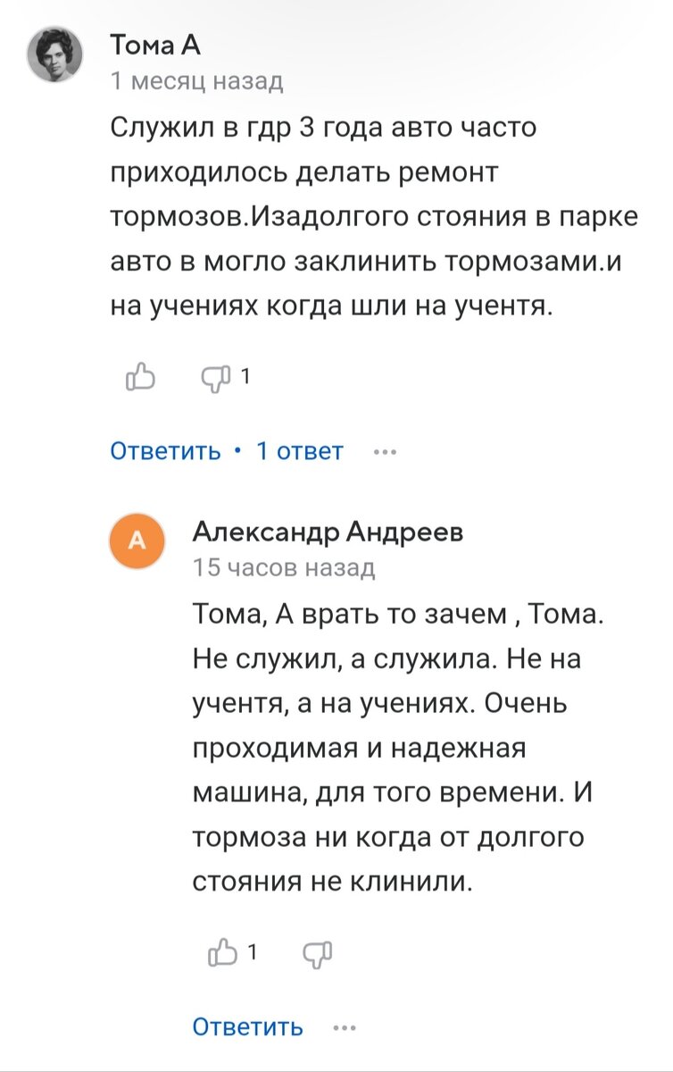 Сегодня некоторые настолько "заигрываются" в интернете, что порой просто забывают кто они есть на самом деле. В стремлениях что-то доказать своему собеседнику, пытаются "раздуть" собственное эго до невероятных размеров, создавая великое множество профилей и теряя в них своё "Я". Всем привет с вами автор канала Иван Путешествует! Но и в виртуальном мире есть добрые люди, готовые в любой момент готовы наставить заблудших овечек на путь истинный. Ниже вы увидите яркий диалог под одним из моих видео, который иллюстрирует мои слова. Из переписки становится понятно, что Тома А, с женской фотографией и женским именем, служил в ГДР целых три года и делал там тормоза, которые часто клинило. На помощь таким "тормозам" вроде "Тома А", пришёл Александр Андреев, который уличил Тому А во лжи. Поскольку Тома А, ну никак не служил, а скорее служила, ведь она же Тома А. Затем Александр обратил внимание Томы А на грамматические ошибки, и наконец полностью опроверг слова Томы А, назвав ГАЗ-63, о которо