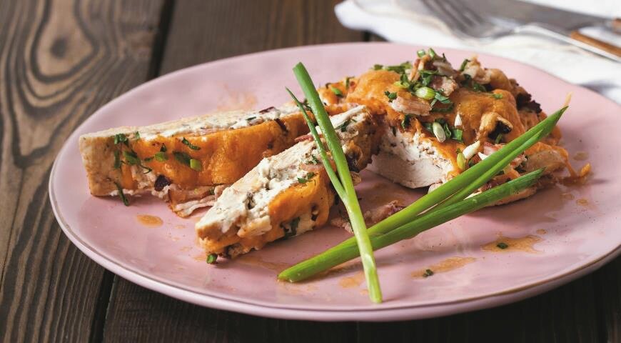 ИНГРЕДИЕНТЫ 4 филе куриной грудки (около 500 г) 4 тонких ломтика бекона или копченой грудинки 120 г сливочного сыра 120 г сыра чеддер 1 ст. л. оливкового масла 1 ст. л. сливочного масла 1 ч. л. чесночного порошка 1/2 ч. л. молотой сладкой паприки 1/2 ч. л. сушеного укропа петрушка и зеленый лук для подачи соль, свежемолотый черный перец ПОШАГОВЫЙ РЕЦЕПТ ПРИГОТОВЛЕНИЯ Шаг 1 Разогрейте духовку до 200 °С. Слегка смажьте маслом керамическую форму для запекания размером 25х35 см. Шаг 2 Надрежьте филе и раскройте, прикройте пищевой пленкой или листом пергамента и слегка отбейте, чтобы получилось ровное филе толщиной 7–8 мм. Приправьте солью, перцем, 1/2 ч. л. чесночного порошка и паприкой. Шаг 3 Нарежьте бекон маленькими кусочками. Разогрейте сковороду на среднем огне и обжарьте бекон до хрустящей корочки. Переложите бекон на бумажное полотенце шумовкой, стараясь, чтобы жир остался в сковороде. Шаг 4 Добавьте в сковороду оливковое и сливочное масло и обжарьте филе до золотистого цвета,