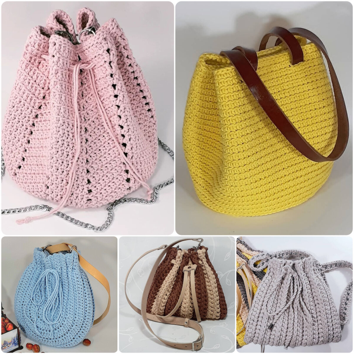 Сумки в форме торбы и кисета это просто мешки с мягкими стенками. Они могут быть с дном или без него. Вверху такие мешочки затягивается на утяжку - именно так они закрываются. Затягивать верх можно разными способами, от этого зависит и вид драпировки стенок. Ручки, как правило, у таких сумок длинные, чтобы можно было носить их через плечо. Предназначение сумок самое разнообразное - это могут быть походные, спортивные сумки, шопперы и, даже, вечерние. Все зависит от материала, из которого связана сумка, размера, узора и украшений. В моей копилке придуманых сумок есть несколько таких торбочек. Некоторые из них вы видите в коллаже. В следующих статьях я подробнее остановлюсь на каждой из них и дам ссылки на уроки по их вязанию. У вас есть такая сумка? Напишите свое мнение о ней.