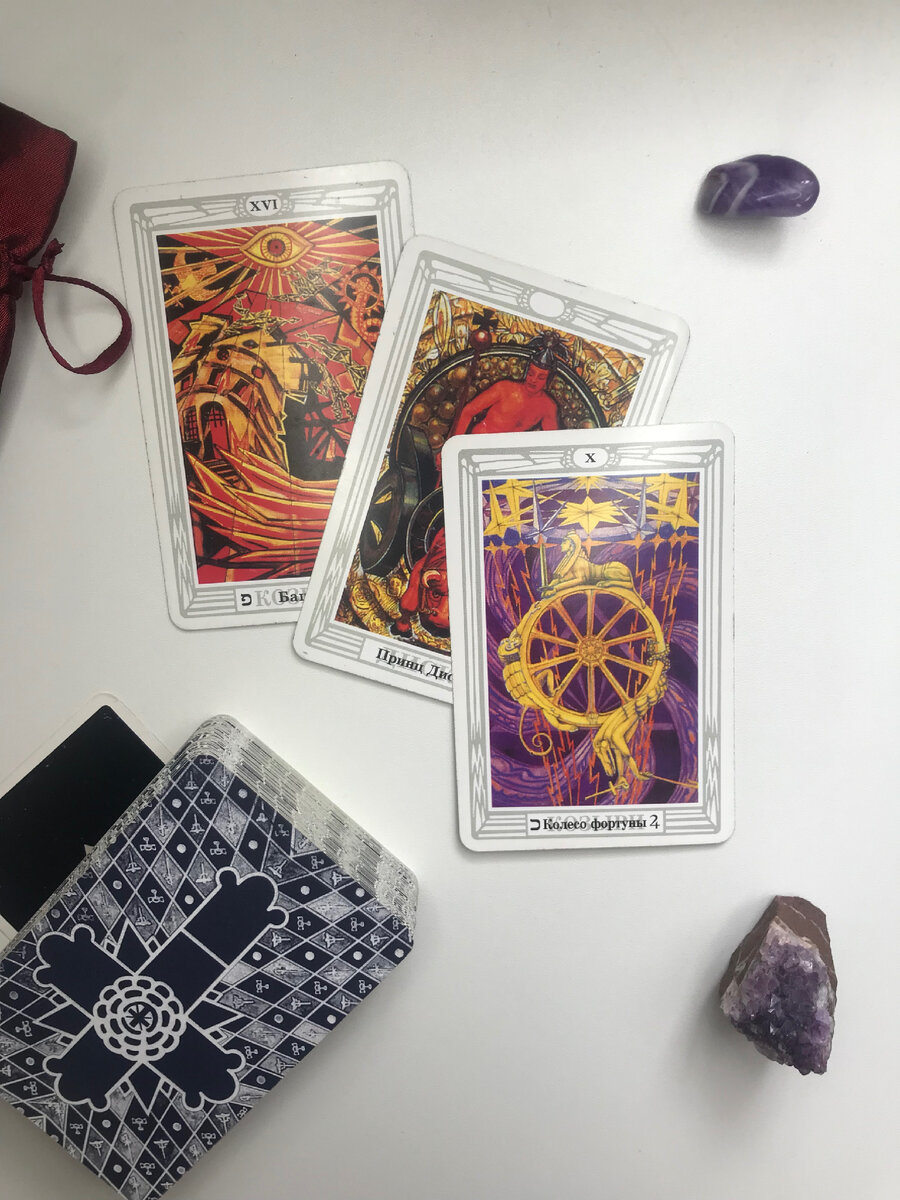 Карта "Башня" обычно ассоциируется с разрушением, крушением и неожиданными изменениями. Это может означать, что ваши текущие отношения подвергнутся серьезным потрясениям или кризису, который может привести к окончанию отношений. Однако, это также может быть сигналом о необходимости пересмотреть свои отношения и начать с чистого листа. Карта "Принца Дисков" символизирует материальную сторону жизни, физические усилия и практичность. В контексте отношений, это может указывать на то, что вы будете находиться в ситуации, где необходимо вкладывать больше усилий и времени, чтобы поддерживать и развивать свои отношения. Карта "Колесо Фортуны" является символом изменчивости и круговорота жизни. В отношениях, это может означать, что будут происходить непредсказуемые события, которые могут изменить вашу ситуацию. Однако, также может быть позитивным знаком, указывающим на то, что вы можете ожидать положительных изменений и везения в отношениях. Сочетание этих трех карт может указывать на нестаби