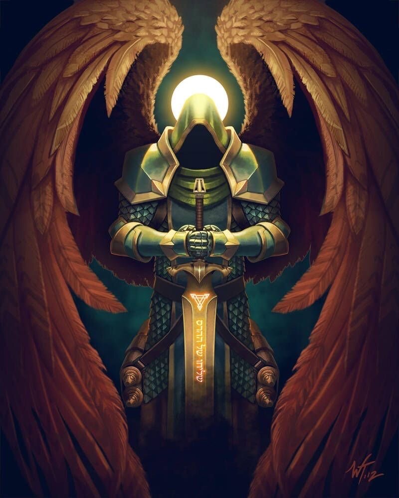 В Псевдо-Дионисиевой иерархии — второй по по- рядку ангельский чин. Название «архангелы» происходит от греческого слова archangelos, «главный или высший вестник». Архангелы, которых называют также «Святыми», осуществляют связь между Богом и смертными; они водят в бой небесное войско против адских полчищ; руководят ангелами-хранителями. Выполняют роль ангелов-хранителей великих людей, таких как главы религий и государств. Они исполняют повеления Бога. Иногда архангелов приравнивают к bene elohim. Архангелы присутствуют в Ветхом Завете, однако в греческой версии Писания термин «архангел» отсутствует. Слово «архангел» отсутствует в греческих версиях псевдоэпиграфических текстов, например произведений енохианского цикла, где называются ангельские чины, но лишь дважды появляется в Новом Завете. В Послании апостола Иуды (1:9) Михаил именуется архангелом, а в 1 -м Послании к Фессалоникийцам (4:16) упоминается безымянный архангел, провозглашающий второе пришествие и воскресение мертвых: «потом