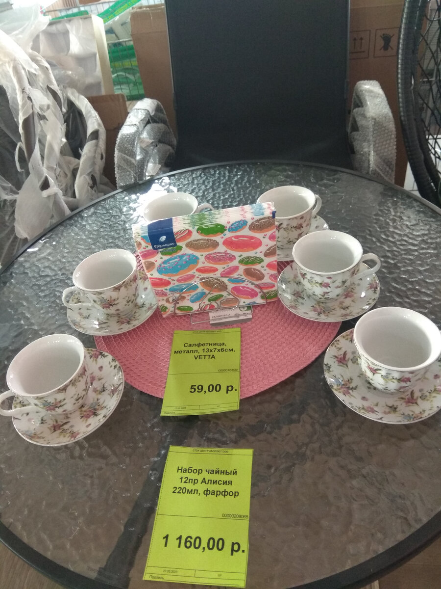 Всем - привет! Магазин "Абсолют" похож на "Светофор" — и помещением, и манерой выкладки товара. Здесь можно увидеть товар в коробках, даже просто на полу на деревянных поддонах. И по ценам он вполне демократичный, правда, не по всем товарам, но давайте посмотрим. Фарфоровый сервиз из шести чайных пар "Алисия"— 1160 рублей. Т.е. чайная пара выходит за 193 рубля, неплохо, наверное, если учесть, что это ещё и фарфор. Сравнила цену на Озоне. Вот как: на Озоне продают дороже, при этом с утратой: А вот, что привезли к Пасхе, да и не только к празднику. Бумажные формы для куличей. Я, правда, такими не пользуюсь, предпочитаю печь по-старинке в формах, что остались от мамы, но это кто как привык. Несколько видов тарелок и корзинок из пластика. Признаюсь, что не люблю такую посуду, но знаю, что многие пользуются. Для дачи, к примеру, покупают. Ажурные, лёгкие, не бьются. Правда, в вопросе, экологии не всё так красиво ( Картинка, конечно же, не ручная роспись и не деколь, но посмотреть так