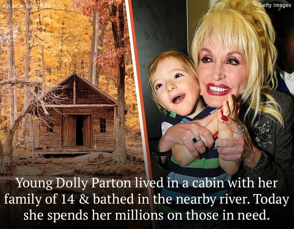 Долли Партон родилась в хижине с одной спальней в сельской местности Теннесси. Ее отец был издольщиком, который не умел читать. По мере роста семьи на старших детей возлагалось больше обязанностей, и Партон, как четвертая из 12 детей, должна была присматривать за своими младшими братьями и сестрами. У детей не было даже своих кроватей, и они спали втроем или вчетвером на одной кровати. Несмотря на бедственное детство, певица описывала свою семью как счастливую и богатую в других отношениях. На самом деле, поклонники любят Партон не только за ее пение и неповторимый образ королевы глэм-кантри, но и за ее щедрую душу. Она тратит большую часть своего дохода на благотворительность. Внешность Партон может быть привлекательной, но ее внутренняя красота определенно завораживает.
