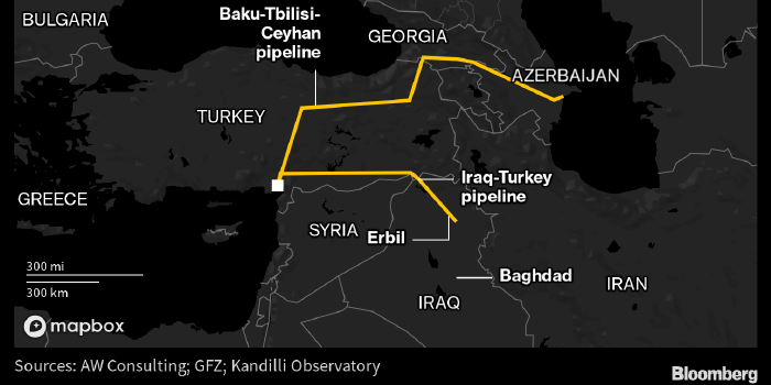 Курдистан достиг соглашения с федеральным правительством Ирака о возобновлении экспорта нефти через Турцию на ближайшей неделе. Цены на нефть могут оказаться под давлением, т. к. на рынок могут вернуться поставки объемом 400 000 баррелей в день. Схема нефтепроводов на севере Передней Азии. Источник: Bloomberg Курдистан — полуавтономный регион Ирака — заявил, что достиг соглашения с федеральным правительством о возобновлении экспорта нефти через Турцию на ближайшей неделе. Перебои с поставками из Курдистана, которые стали следствием юридических разногласий, оказались одним из факторов роста цен на нефть в последние дни. «После нескольких встреч между региональным правительством Курдистана и федеральным правительством (Ирака — прим. ProFinance.ru) было достигнуто первоначальное соглашение о возобновлении экспорта нефти через (турецкий — прим. ProFinance.ru) Джейхан на этой неделе», — сообщил в воскресенье в соцсетях пресс-секретарь курдского регионального правительства Лоук Гафури. В мар