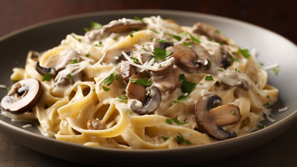 - Добавь приготовленные фетучине и грибы в сковороду, перемешай, чтобы они покрылись соусом. Если соус слишком густой, добавь немного воды из-под макарон, чтобы разбавить его.