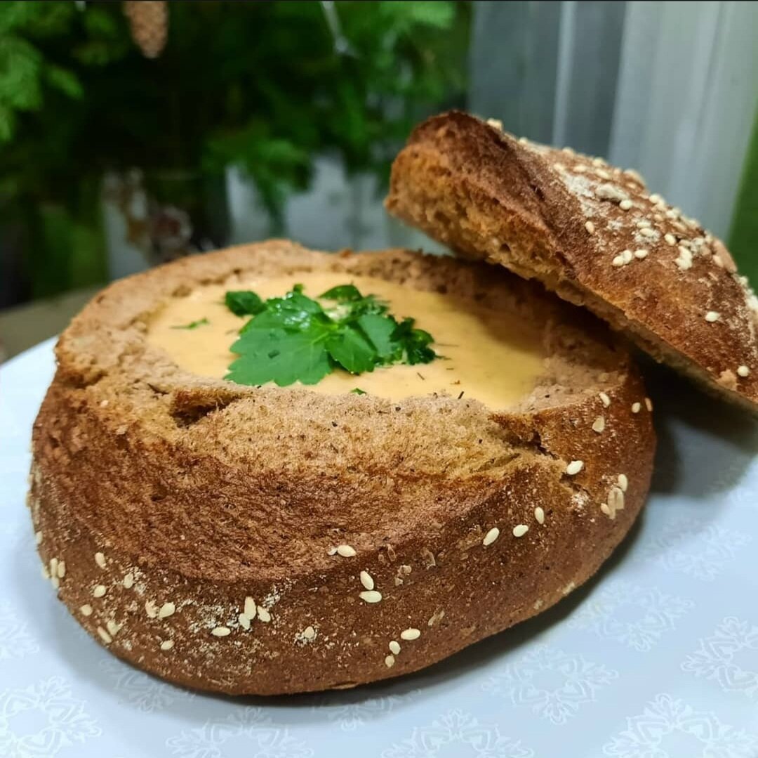 8. Для сервировки можно подавать крем-суп в булке хлеба (заранее вытащив из середины мякоть), добавляем зелень