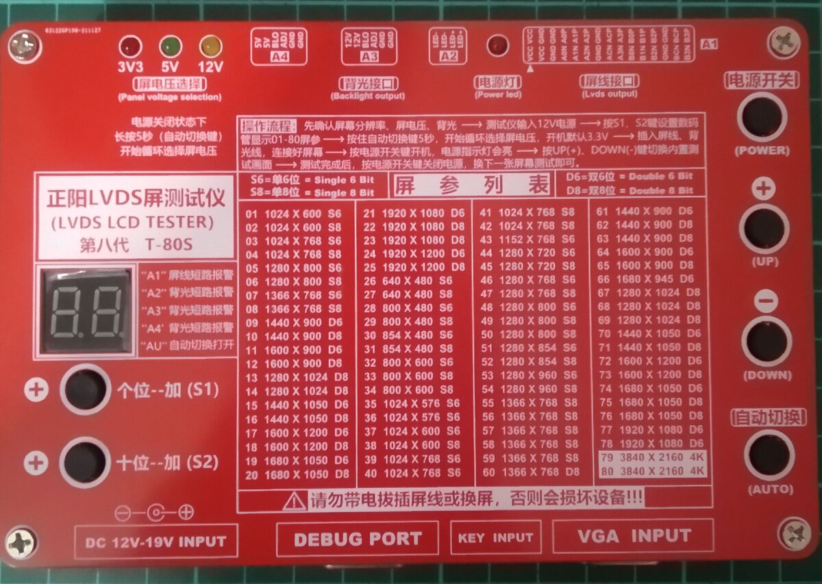 Попробовал сегодня подключить к прибору матрицы, которые лежат у меня, неисправные. Но об этом в конце. Начну с описания, что входит в комплект. Сам прибор, с блоком питания. Комплект щупов и провода с крокодилами. Три инвертора для матриц с ламповой подсветкой. На 1, 2 и 4 лампы, с соединительными проводами в комплекте. И набор шлейфов. 15 штук. Шлейфы отличаются зеркальным расположением, разрядностью сигнала, и типами разъёмов. Назначение кнопок и разъёмов. Подключил матрицу от ноутбука LTN156AT24-L01. ДЛя этого нужно знать несколько параметров. А именно: разрешение, тип сигнала-разрядность, напряжение питания схемы матрицы, напряжение питания на схему подсветки. Для примера находим даташит на матрицу LTN156AT24-L01. Смотрим. И для полноты на сайте www.panelook.com смотрим параметры для нужной матрицы. Разрешение и напряжение питания схемы матрицы. Питание подсветки. Распиновка разъёма. 2-3 это питание самой матрицы, 38-40 питание схемы подсветки. С сайта . Выбираем на