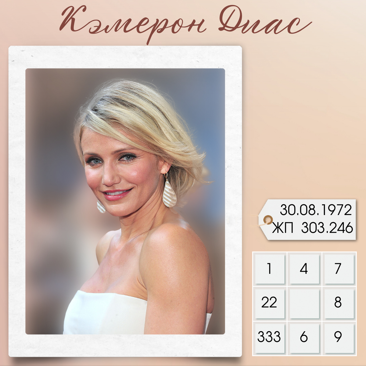 По просьбе наших подписчиков я рада представить пост о звёздной красотке Кэмерон Диаз!🤩 ⠀ Жизнерадостная блондинка дебютировала в мир кино ярко, громко и с первого дубля, обозначив свое место в списке выдающихся актрис. Ее первый опыт в кинематографе состоялся в фильме «Маска». При этом Кэмерон уже пять лет успешно работала моделью в качестве лица Calvin Klein и Levi’s.💁🏼♀️ ⠀ Жизненная философия Кэмерон позволяет ей играючи добиваться невероятных успехов. Это достаточно просто, если дата рождения и обстоятельства гармонично располагают к этому. В матрице присутствует показатель успешности «удача 7», подкрепленный замечательной «энергией 22», трудоспособностью «здоровье 4» и желанием быть всегда в центре внимания «характер 1». ⠀ Жизненная программа 303 говорит о склонности к застреванию в эмоциональных состояниях, иногда это может проявиться в депрессиях или зацикливании на страхах. Это одна из задач, которую предстоит решить людям с данной программой. У Кэмерон невроз навязчивых мы