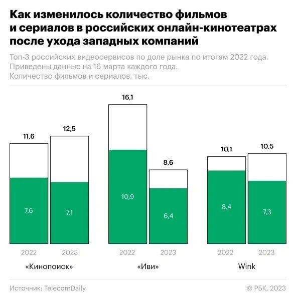 В течение года с марта 2022-го объем контента крупных западных киностудий на российских площадках уменьшился в 1,5-2 раза. Однако эксперты подчеркивают, что общие потери зарубежных кинолент не такие значительные. По статистике на 16 марта, больше всех на себе сокращение количества голливудских фильмов ощутил сервис «Кинопоиск»: с 2 тысяч до чуть менее 1 тысячи кинолент. Онлайн-кинотеатр «Иви» также заметил уменьшение общего количества фильмов и сериалов. Это произошло из-за изменения стратегии сервиса: компания, предположительно, переключила акцент с объема фильмов и сериалов на их качество. Меньше всех при этом пострадал третий по популярности стриминговый сервис России — Wink. С подробной инфографикой можно ознакомиться на приведенной гистограмме. Заглавное фото: Unsplash