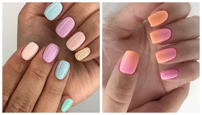 Пора перейти на весенний маникюр. Если вам не хватает идей по этому поводу, оставайтесь с нами, дальше вы узнаете, какие варианты дизайна уже в этом сезоне будут на пике популярности. Дизайн «градиент» смотрится эффектно и благородно. Он может быть выполнен, как в пастельных оттенках, так и более ярких. Летом его можно сделать в неоновых цветах, а весной 2023 года в приглушенных пастельных. Чтобы ручки выделялись и смотрелись ухоженно, маникюр можно дополнить яркими акцентами — окрасив несколько ногтей в однотонный пестрый цвет. Глянцевый финиш добавит маникюру завершенности и изюминки. Легкий переход от розового к оранжевому выглядит гармонично и по-весеннему. Также пользуются популярностью следующие цветовые комбинации: розовый + голубой, желтый + оранжевый, голубой + бирюзовый и даже радужный маникюр, который может включать в себя три и более оттенков одновременно с плавным переходом. Перед вами еще один стильный вариант маникюра, этот дизайн смело можно назвать «радужным». Нейл мас