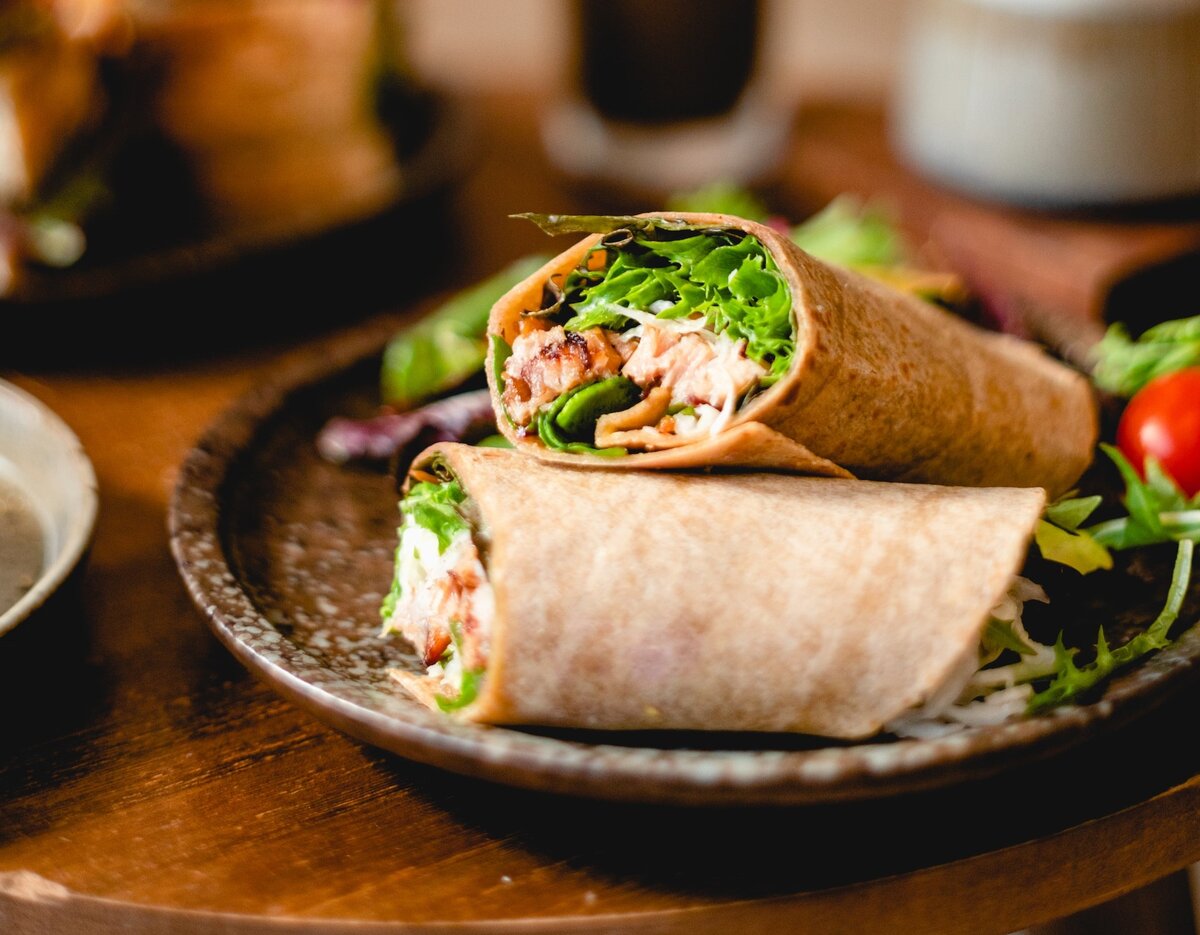 - Возьмите лепёшки, намажьте их песто, затем выложите салатные листья и все овощи и добавьте майонез и кунжут, если нужно — посолите.