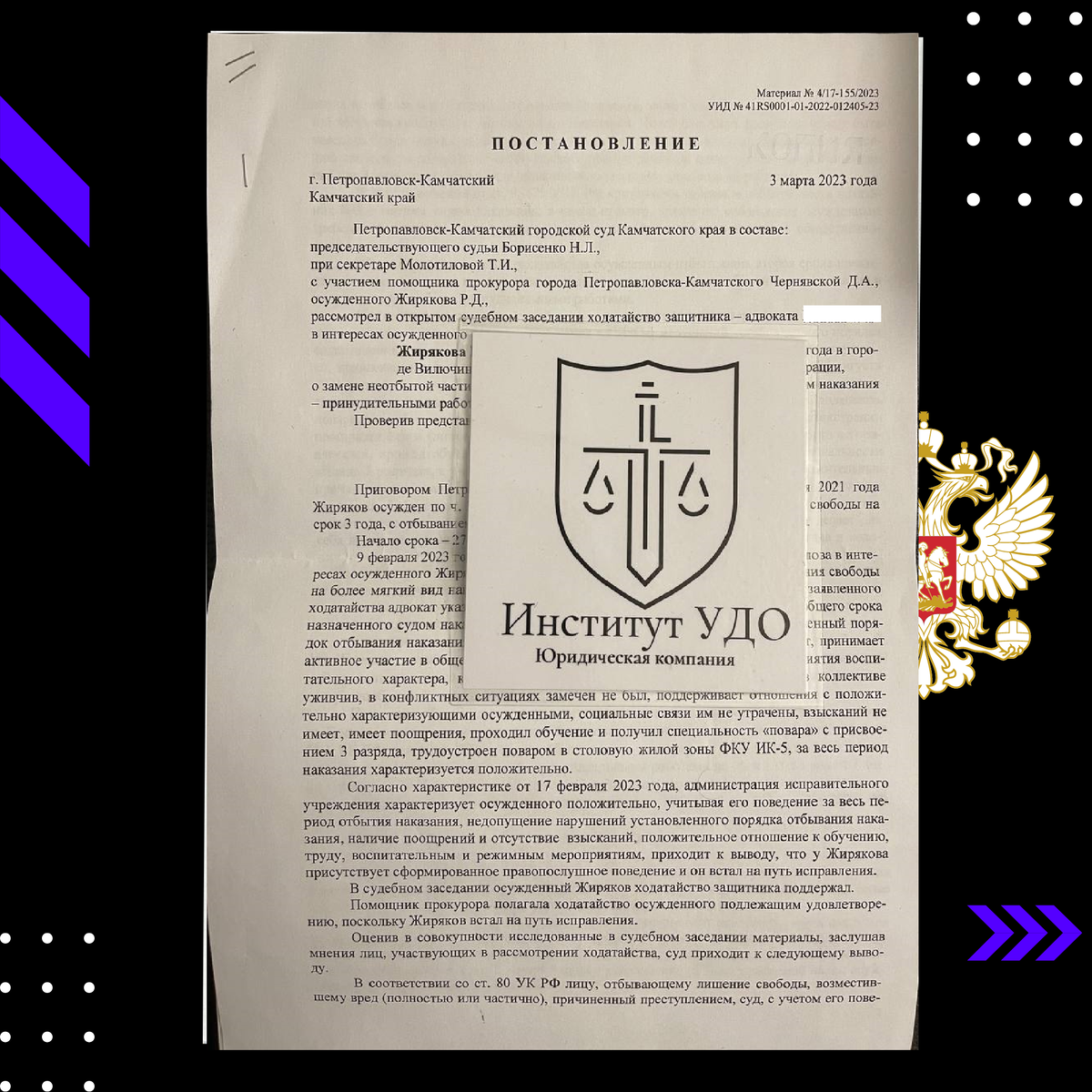 Обстоятельства дела: г. Петропавловск - Камчатский. Осужденный по ч.3 ст. 30 п. "г" ч.4 ст. 228.1 УК РФ к 3 годам лишения свободы. Отбыл 1\2 часть срока наказания. Начало срока 27.04.2021. конец срока 10.04.2024 года. По поведению все положительно, трудоустроен, поощрения и т.д. Изначально мы подали ходатайство но нам к удивлению отказали в его принятии и прекратили производство в связи с тем, что в ч.2 ст. 80 УК РФ в части замены наказания на принудительные работы для лиц осужденных за особо тяжкие преступления - стало возможным обратиться только по отбытии 2\3 части срока назначенного судом наказания. Об этой стадии разбирательства по данному человеку мы писали статью https://dzen.ru/a/ZAG3c31zwQ4v__Ei и в видео упомянули https://dzen.ru/video/watch/6422fb0e02f73d4ab5307475?share_to=link. - подробнее о том, как в суде апелляционной инстанции мы доказали свою правоту. Федеральным законом от 24.09.2022 N 365-ФЗ, внесены изменения в ст. 80 УК РФ, которыми УВЕЛИЧЕНА с 1\2 до 2\3