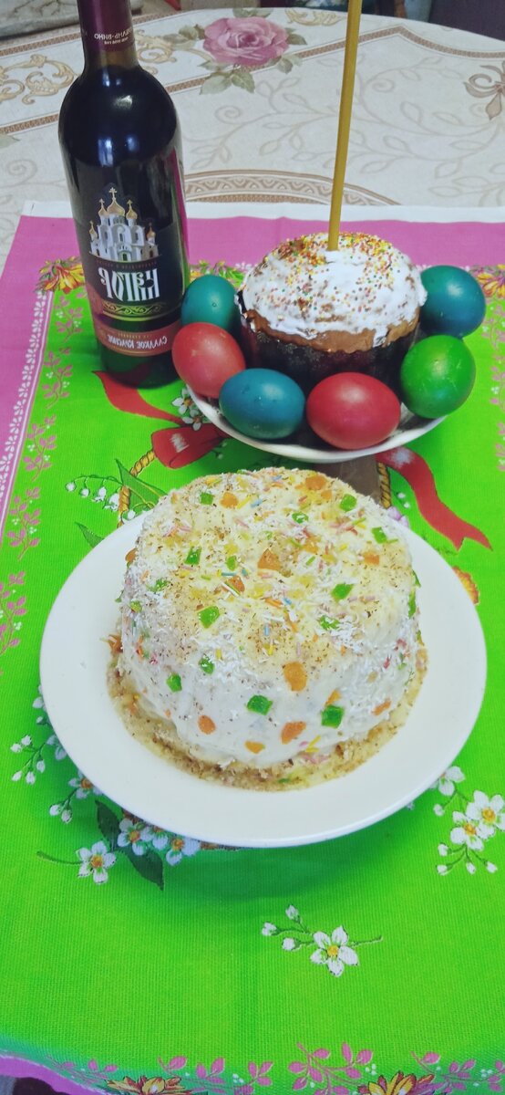 Всем привет. Сейчас поделюсь с вами рецептом моей любимой творожной пасхи. Я её просто обажаю. Ингредиенты: 800 г творога, 2 стакана сахара, 100 г сливочного масла, по 0,5 стакана сметаны, очищенного и измельчённого миндаля, изюма, 5 яиц, 0,5 ч. ложки соли. Способ приготовления: Творог я протераю через сито, добавляю сметану и хорошо перемешиваю. Масло топлю добела с сахаром, постепенно добавляю яйца и продолжаю растирать до полного растворения кристаллов сахара. Затем эту массу соединяю с творогом, добавляю промытый и высушенный изюм без косточек, миндаль. Заполняю форму массой, прикрывают блюдцем с небольшим грузом и ставлю в холодильник на 1-2 дня. Готовую пасху выкладываю на блюдо, обмазываю сметаной и украшаю по своему желанию.