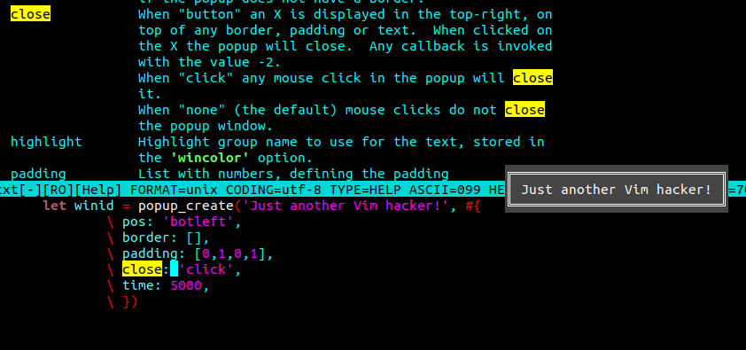 Привет, коллеги. Вим развивается, и в версии 9 появились всплывающие окна. В оконной версии они уже давно есть, а теперь вот и в консоли тоже. Это временные окна, всплывающие поверх других окон и закрываемые автоматически (по времени), по щелчку мыши на кнопке закрытия, просто по щелчку мыши или клавиши, вызовом функции (из скрипта, который окно открыл, или пользователем), вызовом функции, закрывающей все такие окна разом. Они могут вывести срочное сообщение, задать вопрос, выводить какую-то актуальную информацию (наподобие строки информации) и всё в таком роде. Проверьте, доступны ли вам всплывающие окна (popup window), дав команду :echo has('popupwin') Если увидите 1, то доступны, а если 0 - то нет. Вся информация доступна в Справке (конечно, если Вим достаточно новый) по запросу :help popupwin Возможности работы с таким окном ограничены, что и понятно. Доступ к таким окнам весь - через функции: выполнить команду, задать опцию, закрыть, создать окно. В таком окне может быть даже зап