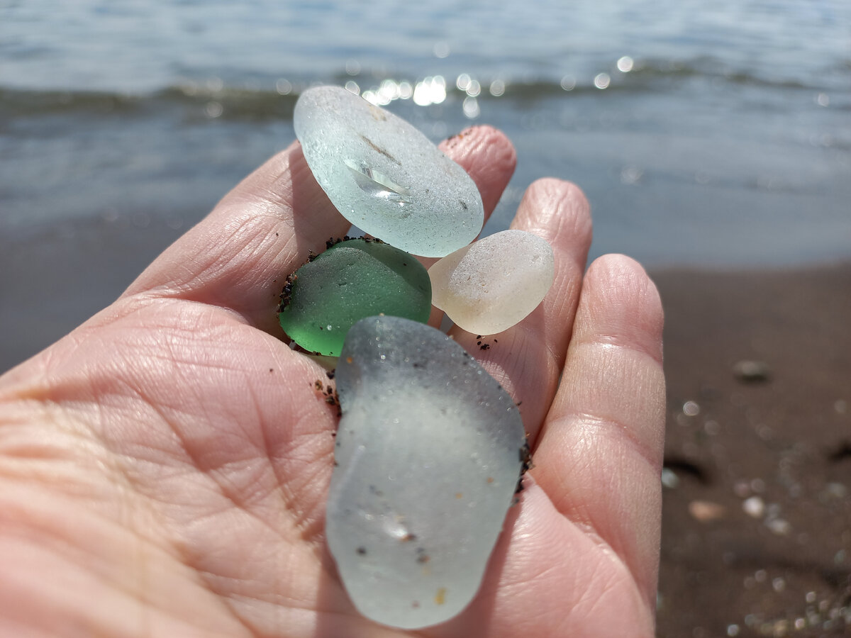 Окатанные обломки стекла на пляже, по которым бухта получила своё название, образовались из-за бутылок, которые целиком или битые доставлялись волнами и течением в бухту с близлежащей свалки» Битое стекло, осколки кафельной плитки и старой посуды происходят с городской свалки «Горностай» Также на свалку свозились отходы с фарфорового завода. Свалка просуществовала с 1967 года до 2012 года, когда во Владивостоке состоялась 24-я ежегодная встреча лидеров экономики АТЭФ. Фрагменты стекла сохраняются на пляжах рядом с бывшей свалкой из-за географических и метеорологических характеристик местности: благодаря преобладающим здесь юго-восточным ветрам всё приносимое морем выбрасывается на берег.От смывания местные пляжи сохраняются закрывающими их от восточных ветров мысами.Вся прибрежная полоса на ширину 5—10 метров покрыта разноцветной стеклянной «галькой» размером 2—5 см.