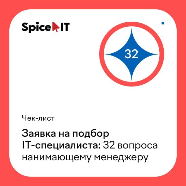 Снятие заявки по вакансии — важный этап в работе рекрутера, который позволяет ему узнать, кого ищет нанимающий менеджер, какие soft skills и hard skills нужны на новой позиции, какие задачи и проекты будут у специалиста и т.д. Понимание профиля кандидата ускоряет закрытие вакансии. И наоборот: если заявка снята неправильно, найм затягивается, а бизнес несет убытки. 📝👉На основе практики рекрутеров Spice IT мы подготовили чек-лиcт с вопросами, которые необходимо уточнить у заказчика перед поиском IT-специалиста. Чем подробнее вы зададите вопросы менеджеру, тем лучше получится составить профиль кандидата и описание вакансии. Адаптируйте чек-лист под себя и дополняйте вопросами, которые касаются внутренних процессов вашей компании. Подписывайтесь на наш Telegram, где мы делимся накопленным опытом, отвечаем на вопросы и освещаем актуальные новости 👉🏻 https://t.me/ithrtimes