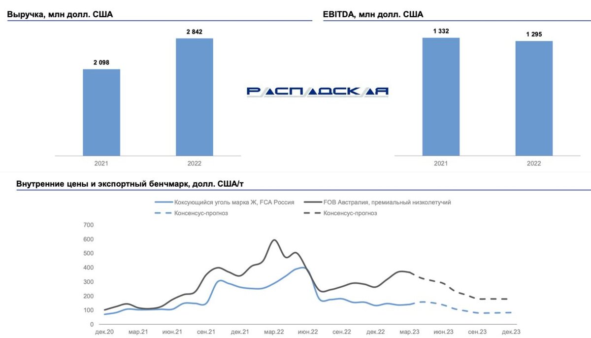 По данным Минэнерго РФ, добыча угля в России в 2022 году сопоставима с 2021 годом и составила 443,6 млн тонн. Экспорт снизился на 7,5%, до 210,9 млн тонн при одновременном росте поставок в Азиатско-Тихоокеанский регион, а вот продажи на внутренний рынок выросли на 12,2%. Сегодня разберем одного из крупнейших представителей отрасли. Выручка 📈Итак, выручка Распадской за отчетный период выросла на 26% до 194,2 млрд рублей. Основной вклад внесла позитивная ценовая конъюнктура. Цена реализации коксующегося угля составляла в среднем чуть более $300 за тонну, против $200 в 2021 году. При этом объемы поставок продолжили сокращаться. Радует улучшение географии продаж. Страны АТР выбирают все больше продукции, а их доля уже приблизилась к 50%. Продажи в ЕС не превышают 2%. 💬Кредитно-рейтинговое агентство Fitch пересмотрело прогноз цен на австралийский коксующийся уголь в 2023 году с $300/т до $350/т, что окажет позитивный эффект. Только вот прогноз самой компания менее позитивен и предполагае