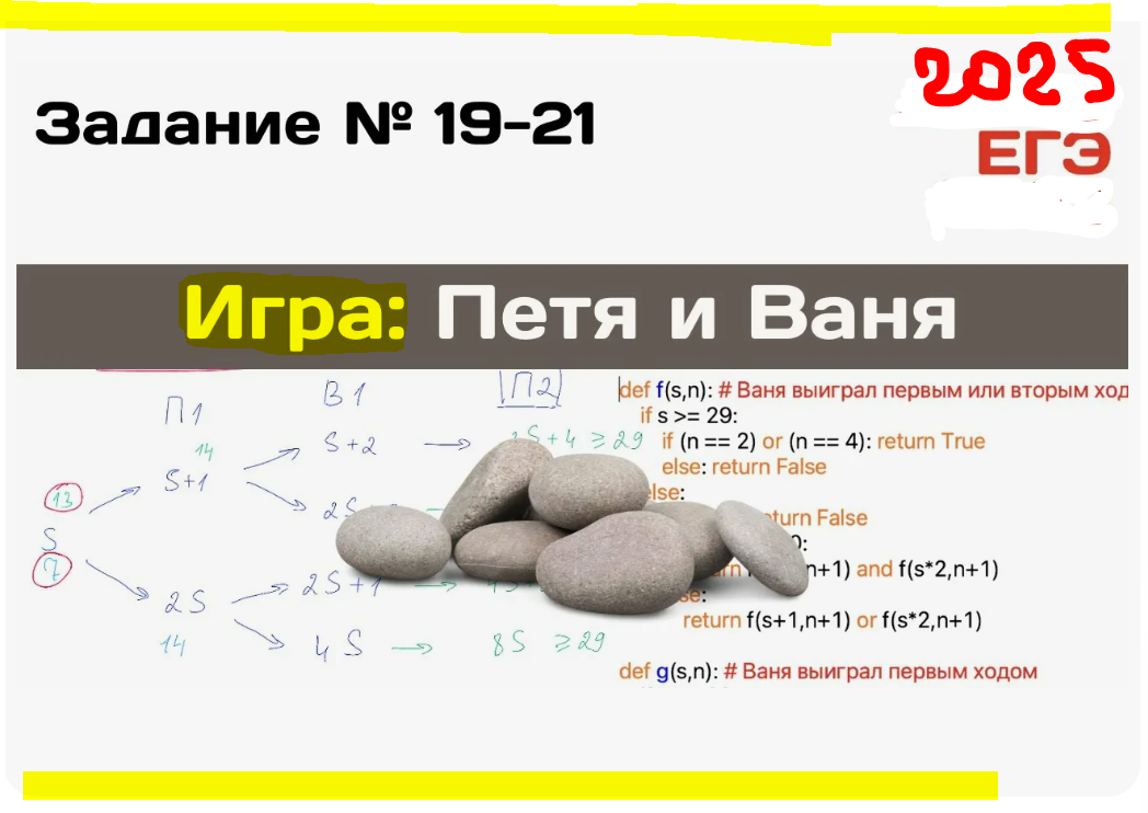 Задание 19-21 многие очень любят, другие просто ненавидят. Но факт остается фактом - решить их может любой - вопрос времени и усидчивости. предложу для вас 3 варианта - программой, вручную и с помощью электронных таблиц, а там выбирайте, что больше нравится Вот программа и объяснение, где одна куча у Пети и Вани, смотрите: условие коротко: Вот еще пример на 1 кучу, тоже все предельно ясно. Ниже несколько задач на 2 кучи. Способ мало отличается, но покажу пример про неудачную стратегию. Коротко - вопросы, в видео - сама формулировка. № 7809 с сайта К.Ю. Полякова ______________________________________________________ Первый вопрос, коротко (видео ниже): 2. Далее: п Вот видео разбор аналитически, без использования мощностей компьютера Вот еще задача с разбором в Excel Это задача № 2409 с сайта Полякова. Типичная, базового уровня, на 2 кучи.
