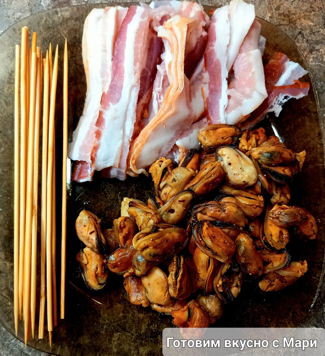 Каждую мидию заматываем в полоску бекона (если бекона много, можно разрезать пополам) и нанизываем на шпажки.