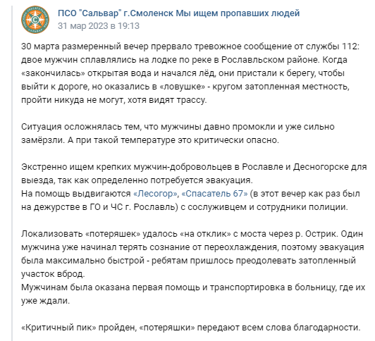 И вот, тот самый случай. Поисковый сезон в Смоленске начался неожиданно и остро. Мужики переправлялись на лодке, промокли и замерзли, а, когда причалили к берегу, угодили в болото. Людей спасло лишь то, что товарищ из "Сальвара" в этот день работал спасателем в Рославле и находился на дежурстве, то есть, выехал максимально оперативно.