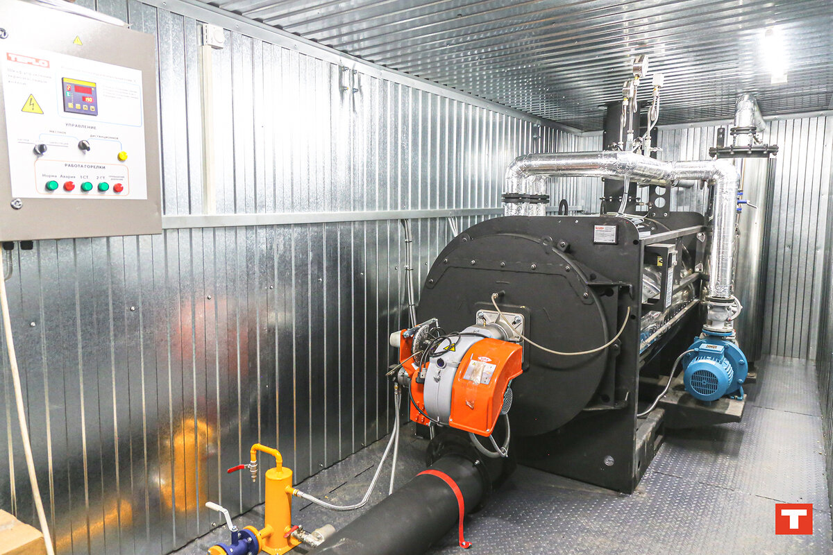 Блок-контейнер выполнен в транспортном габарите и удобен при перевозке. В остальном — это стандартный КТМ от TEPLO, который оснащается итальянскими горелками «Baltur», насосной группой «Calpeda» и запорно-предохранительной арматурой от проверенных поставщиков.