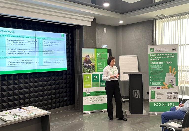В этот раз ракурс внимания в технологии возделывания основных культур региона был смещен на вопросы управления продуктивностью с помощью минерального питания и фунгицидной защиты. Марина Бекасова - эксперт по защите растений Кирово-Чепецкой Химической Компании представила информацию о линейке фунгицидов в портфеле компании, и поделилась практическими рекомендациями об особенностях выбора продукта для защиты растений от патогенной инфекции. Место такого продукта, как фунгицид Гранберг Про, КЭ в системе защитных мероприятий многих культур и нюансы его применения, стало центром обсуждения вопроса. Это системный фунгицид с отличным куративным действием. В составе продукта Пропиконазол, 300 г/л и Тебуконазол, 200 г/л. Оптимальное сочетание действующих веществ в продукте обеспечивает значительный диапазон фунгицидного действия с отличным пролонгированным эффектом. Позволяет надежно контролировать широкий спектр патогенов и обеспечить возможность культурам реализовать потенциал продуктивности