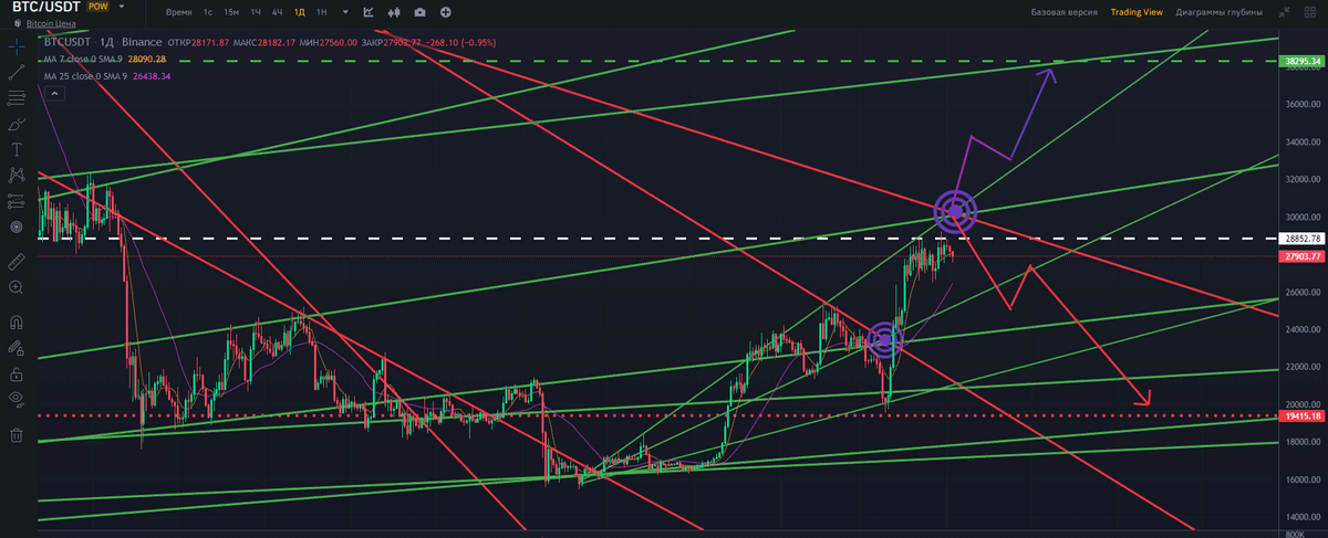 Добрый день друзья! Сегодня мы рассмотрим вероятность движения Битховена, посмотрим стаканы и новостной экономический фон. На графике мы видим, что Биток находится в верхней зоне боковика веры, и судя по графику мы можем легко пойти на цифры 24,21 или даже 19К, причем в последнем случае мы увидим пробитие нижней трендовой зеленой линии, и это будет очень плохим знаком для Быков. Но все не так плохо, так как если взглянуть на стаканы, то все становится более оптимистично. Чет там в Стакане? В стакане на покупку первой крипто валюты мы видим довольно плотные заявки на покупку, и для того, чтобы мы увидели снижение цены до 19К, нам нужно чтобы было продано 3525 Биткоинов, а это, на секундочку, 85 Миллионов долларов, а с условием царящей на рынке жадности, индекс жадности 63. Такой вариант выглядит не сильно правдоподобным. При этом стакан на продажу Битховена выглядит очень даже оптимистично. Мы видим что основная часть продавцов, будет разгружаться на цене в 29 и 30К и если покупатели с