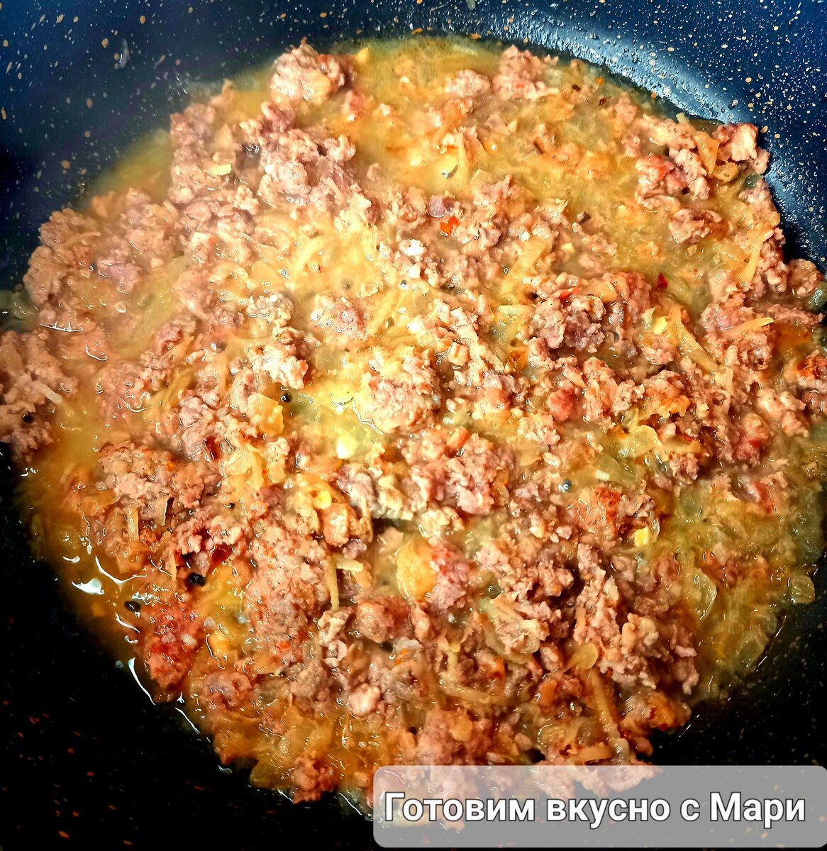 Фарш обжариваем 5 минут на сковороде с мелконарезанным луком, немного соли, добавляем любимые специи, чеснок. Оставляем тушиться 10-12 минут, при необходимости добавляем воды. Выкладываем готовый фарш на одну половинку лаваша, отступая от