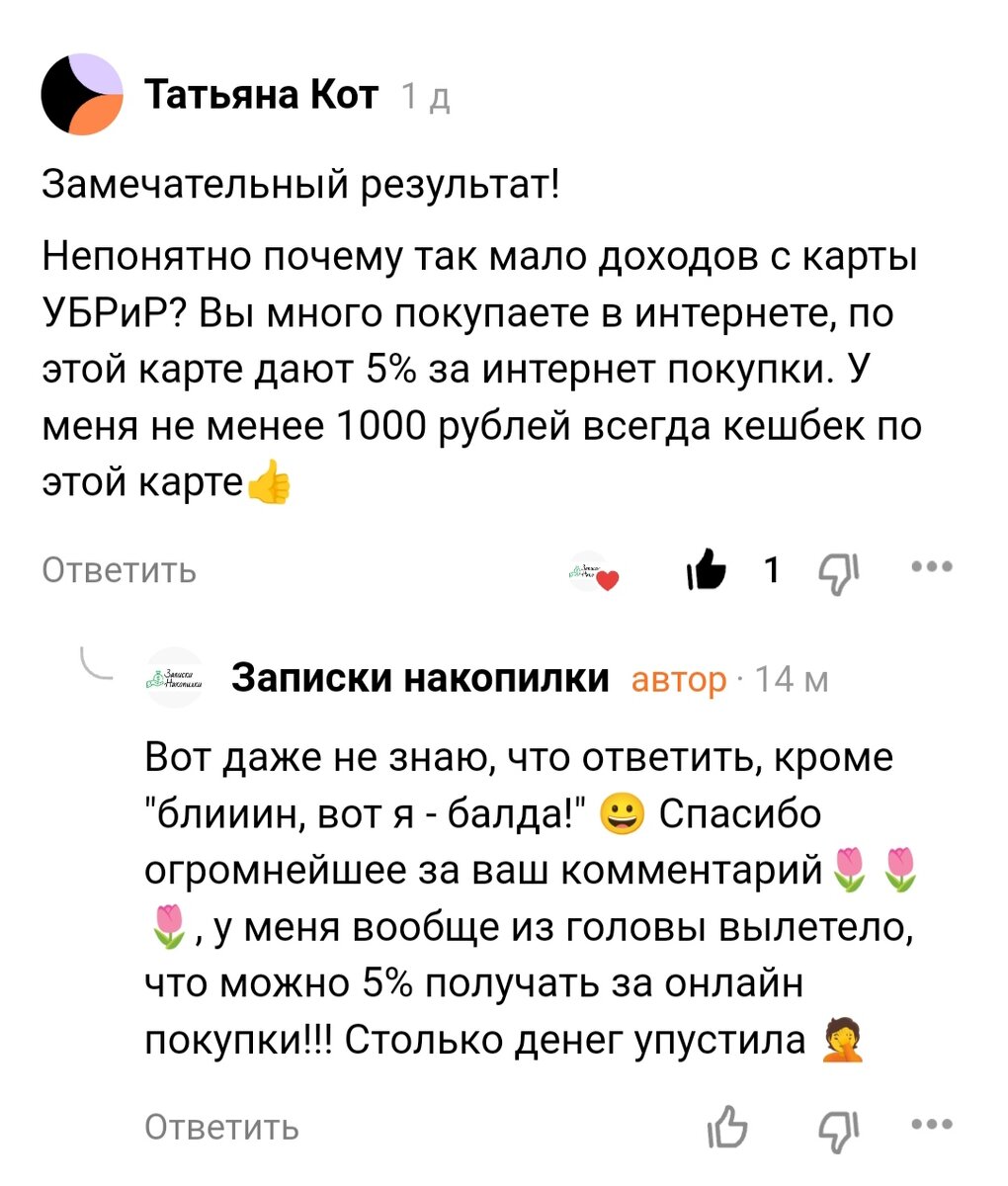 Приветствую, друзья! Сегодня я хотела вам рассказать о своих продажах и перепродажах на Авито, но буквально один комментарий изменил мои планы. Сначала хочу ещё раз поблагодарить свою тёзку, Татьяну, за проявленную бдительность! 💐❤️😀 Я банально забыла про эту опцию в УБРиР и теряла деньги на ровном месте 🤦 И небольшое пояснение для тех, кто пока не понял, что происходит. Пару дней назад я рассказывала обо всех своих дополнительных доходах "из воздуха", которые откладываю в копилку в рамках марафона. В публикации упомянула карту банка УБРиР, с помощью которой получила кешбэк в размере 547 ₽, из которых 500 ₽ - 5% за коммуналку. На что и получила закономерный и очень правильный вопрос 😀😀😀 С одной стороны, я очень расстроилась, почувствов себя растяпой, которая упустила выгоду, просто оплачивая покупки не той картой! Судите сами, только в марте у меня было совершенно покупок онлайн на 26000 ₽ ( это без учёта продуктовых заказов), 5% от этой суммы - 1300. Если бы я платила картой УБ