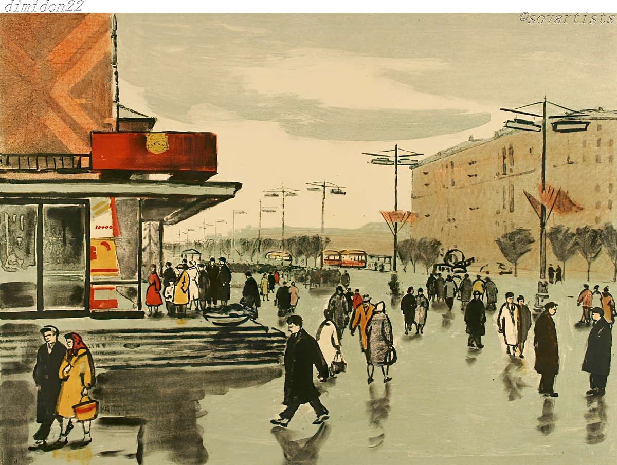 Чарнецкая Милица Сергеевна (24.05.1914, Шадринск Пермской губернии - 05.02.1997, Пушкин С-Пб). «Москва. У кинотеатра «Прогресс». 1960-е гг.; Бумага, автолитография цветная; 421 х 547 мм.; (Омский областной музей изобразительных искусств имени М.А. Врубеля). Источник: Художники СССР 1950-1990 | ВКо Мне нравятся очень такие картины. Лаконично и казалось бы просто, но попробуйте так нарисовать: на картине люди движутся, о чем-то говорят, живут! А фонарные столбы убегают за горизонт, в мокром асфальте отражает серое октябрьское небо, ветер полощет флаги. И что это шестидесятые годы, ясно и без даты создания автолитографии.