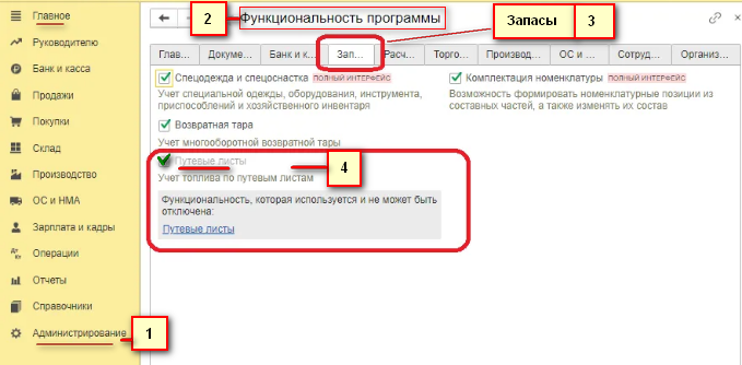 - выбрать сначала «Администрирование», далее – «Функциональность», затем – «Запасы»;