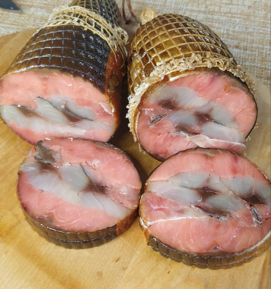 Рулет из рыбы холодного копчения! Горбуша,Скумбрия! Горбушу разделать на половинки,убрать все кости,брюшко отрезать,мясо снять с брюшка,(его потом в рулет) Скумбрию разделать,убрать все кости,снять со шкуры! Посолочная смесь на 1 кг рулета Соль мелкая(экстра)-50 гр. Сахар-25 гр. Пересыпать этой смесью все кусочки рыбы (так же мясо снять с хребта можно ложкой) все половинки рыбы,оставив чуть чуть соли для натирания после формирования рулета,на половинку горбуши укладываем филе скумбрии и все кусочки,накрываем второй половинкой горбуши(чешую с горбуши счищаем) Формируем и в сетку,обтираем остатками посолочной смеси,заворачиваем в стреч.плёнку пищевую,и снова в сетку,так отправляем в холод(температура от -3 до+3) на 1 сутки(24 часа) После снимаем сетку и стреч плёнку и снова в холод на 1 сутки(24 часа)после обсушка,вялка!Я сушил 5 часов с перерывами 3:1:2 ,после само копчение(ольха)дым пустили,дали температуру в коптильне 30 градусов на 10-15 минут,после температура уменьшается до 20-24 г