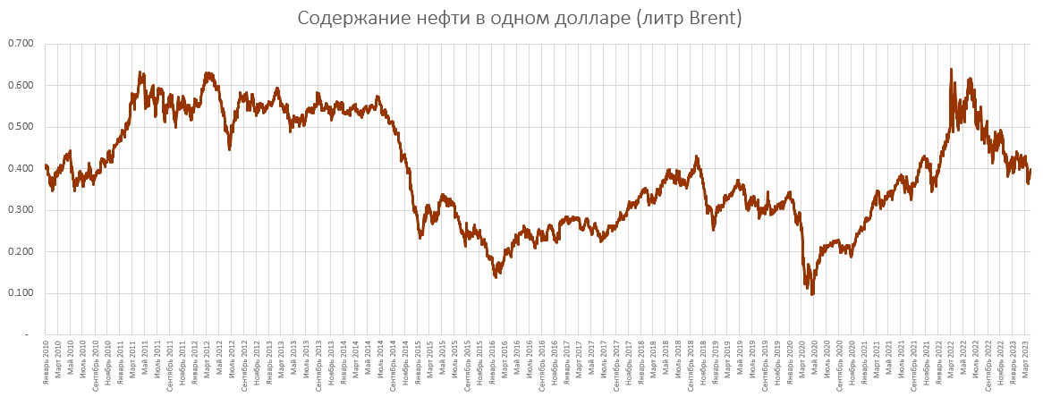 Начнем с простого сравнения: Сколько нефти Brent можно купить на 1 доллар? Смотрим график: 14 лет назад на 1 доллар можно было купить 0.4 литра нефти. Сейчас на 1 доллар можно купить... те же 0.4 литра нефти. Другими словами, доллар, как эквивалент стоимости нефти - образец стабильности. Что это значит? Это значит, что рост количества долларов, печатаемых правящим классом США, примерно соответствует росту добычи нефти в США. А это в свою очередь означает, что с американскими деньгами пока все порядке. Поменьше слушайте всяких проходимцев, приспособленцев и пропагандистов. Сколько нефти Brent можно купить на 1 рубль? Смотрим график: 14 лет назад на 1 рубль можно было купить 80 миллилитров нефти. Сейчас на 1 рубль можно купить менее 40 миллилитров нефти. Россия - нефтедобывающая страна. Но ее национальная валюта не является эквивалентом стоимости нефти. Что это значит? Это значит, что рост количества рублей, печатаемых правящим классом России, примерно в два раза опережает рост добычи