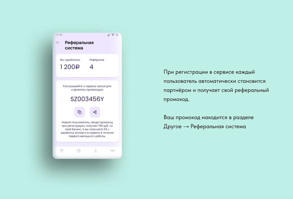 Рекомендуйте сервис sozvon.pro и получайте вознаграждение Вы будете получать 5% с заработка эксперта в сервисе в течение первого месяца его работы в sozvon.pro. Ваш реферал получит 100₽ на свой баланс. Рекомендуйте sozvon.pro в своих блогах, личном общении, в сообщениях и зарабатывайте! Подробные условия партнёрской программы размещены по ссылке: http://sozvon.tilda.ws/terms