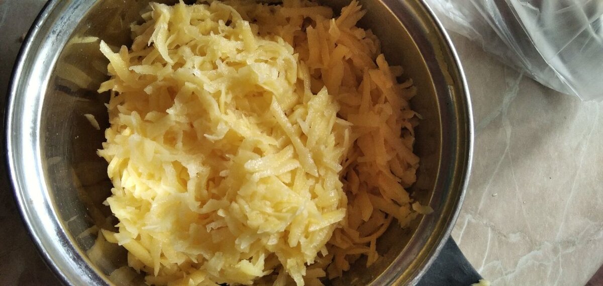 А скорее всего, про хрустящее снаружи и мягкое внутри. Вкус-то у всех разный да и глутамат натрия, или что там добавляют в макдаковскую еду, лично я не использую. По крайней мере, в этом рецепте. Так вот, несмотря на растрёпанный вид, консистенция картофельных оладушек получилась такая, как надо. Полетели! 🚀 Картошку моем, чистим. Натираем на крупной тёрке. Отжимаем от лишней влаги. Ставим на огонь кастрюлю с водой, ждём пока закипит. Картошку переложить в сито или дуршлаг. Как только вода закипела, сверху кастрюли ставим сито с картошкой и бланшируем (или как это правильно называется) в течение 2-3 минут, периодически перемешивая для равномерности. Закончили, картошку остудили, если осталась лишняя влага – отжали ещё раз. В остуженную смесь добавляем муку, специи, соль. Муку можно заменить на картофельный крахмал, но мне с ним почему-то не нравится. Соотношение ингредиентов, как обычно, в конце статьи.👇Хотя спойлер могу сказать заранее, что соли, перца и специй кладу на свой вкус