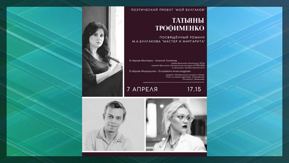 «Брянсккнига» пригласила поклонников творчества Михаила Булгакова на презентацию поэтического проекта-спектакля «Мой Булгаков» его создателя Татьяны Трофименко. Она пройдет в пятницу 7 апреля на площадке «Брянсккниги» в областном центре по улице Фокина,31.