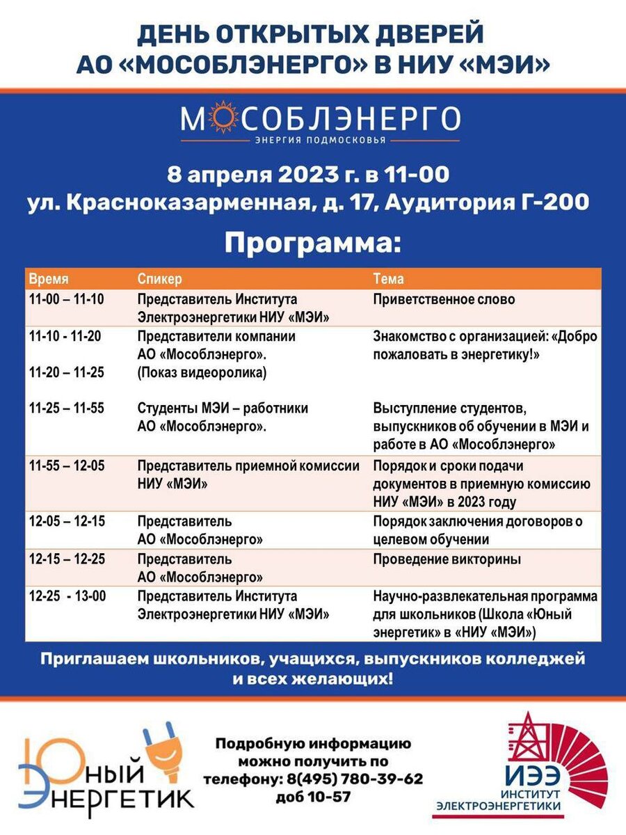 В Московском энергетическом институте (НИУ «МЭИ») 8 апреля 2023 года в 11:00 состоится день знакомства с АО «Мособлэнерго». Мероприятие будет организовано в рамках Дня открытых дверей, на котором абитуриентам представят презентацию компании. Участников ждут в аудитории Г-200. К участию в мероприятии приглашаются выпускники средних общеобразовательных школ и колледжей Москвы и Московской области, желающие стать абитуриентами МЭИ. Представители АО «Мособлэнерго» расскажут гостям мероприятия об основных направлениях деятельности компании, о целевом обучении по направлению от предприятия и возможностях, которые компания может предоставить студентам МЭИ как по прохождению производственной практики, так и по дальнейшему трудоустройству. Также об учебе в МЭИ и о работе в компании расскажут приглашённые на встречу студенты и выпускники ВУЗа. Представители МЭИ познакомят с правилами приема в высшее учебное заведение. «День знакомства с «Мособлэнерго»» проводится в НИУ «МЭИ» ежегодно и традицион
