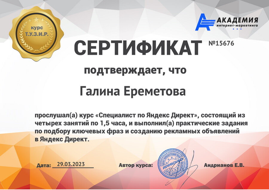 Начало положено, прошло базовое обучение по контекстной рекламе успешно. Впереди 3 месяца обучения по созданию рекламных компаний в Яндекс Директ (РСЯ) и Яндекс Бизнес (карты). По итогам обучения возьму 1-2 заказа на контекстную рекламу по минимальной стоимости, приоритет будет отдан моим клиентам из области создания и продвижения сайтов. P.S. Заказать сайт или любую другую услугу web студии можно по телефонам: +7-918-304-45-34; +7-961-538-07-14 (ватцап/телеграмм). Мои ресурсы по созданию и продвижению сайтов и не только: сайт - https://sochi-web.ru и лендинг - https://sochi-sait.ru