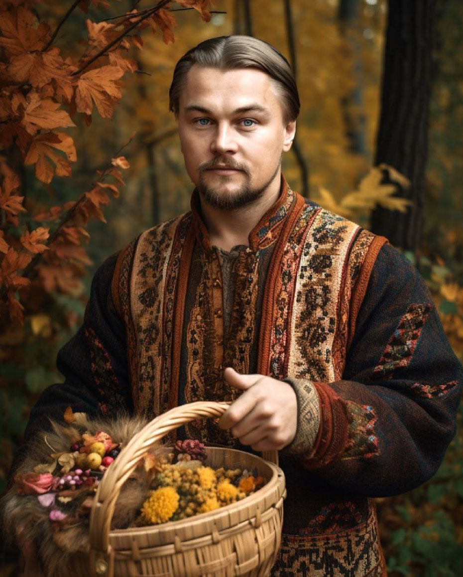 Канье Уэст с венком из ромашек, Илон Маск в косоворотке, Ди Каприо с лукошком. Нейросеть перенесла американцев в Россию