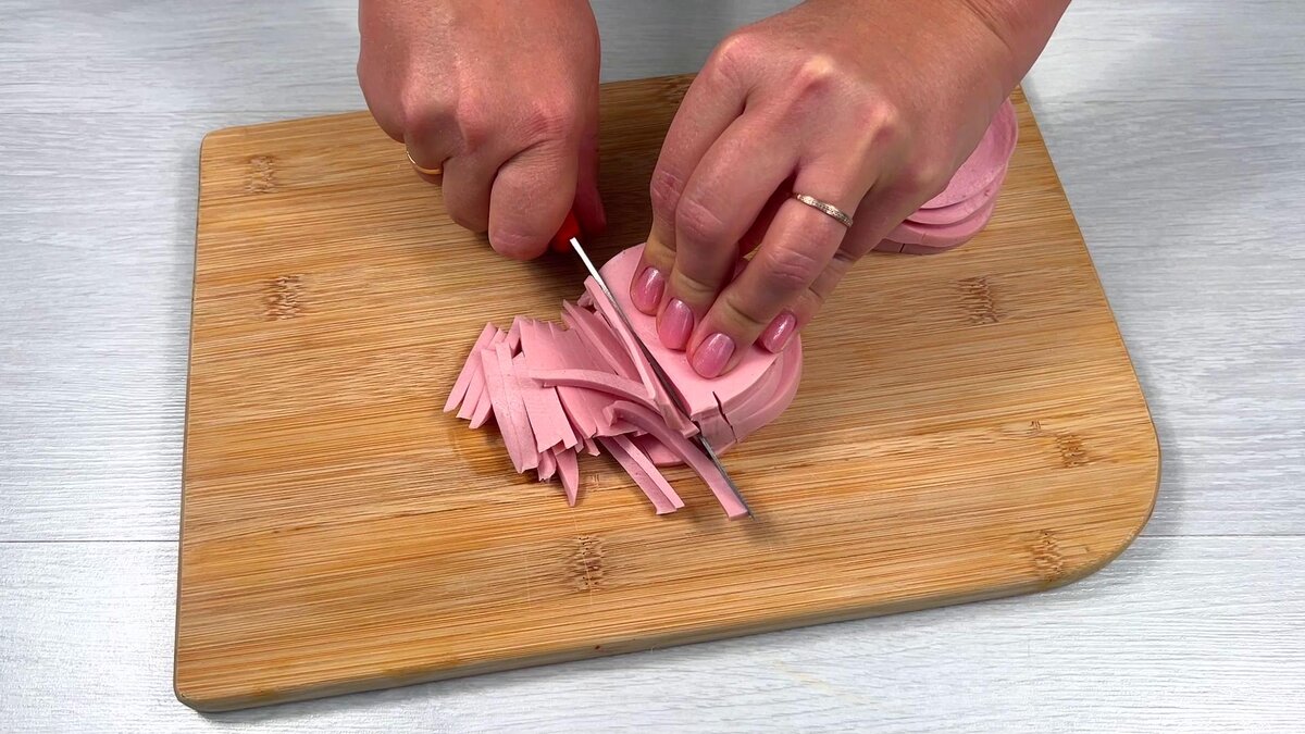 Люблю быстрые и вкусные рецепты. Салат о котором пойдет речь в данной статье, можно приготовить буквально за 5 минут. Предварительно отваривать и натирать на терке ничего не потребуется. Салатик получается очень свежим, вкусным, сытным и ярким. Даже на праздничный стол вполне такой салатик можно приготовить. Здравствуйте, уважаемые читатели! Меня зовут Дарья, я приветствую вас на моем кулинарном канале! Список необходимых ингредиентов для приготовления данного рецепта вы найдете в первом комментарии в конце этой статьи. Переходим к приготовлению:😉 1. Вареную колбасу нарезаю тонкой лапшичкой и перекладываю ее в салатник.