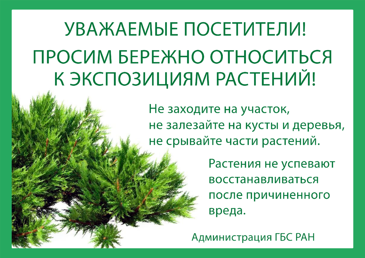 Мы всегда рады посетителям, но только тем, кто бережно относится к растениям и кропотливой работе наших сотрудников. Вместе с вами мы рады наступившей весне и началу цветения растений, однако нас огорчает, что недобросовестные люди вытаптывают газоны с пробивающимися ростками, наклоняют ветви деревьев для получения своих “шедевральных” фото. После такого отношения растения болеют и гибнут. Так, после “пристального” внимания к цветению сакуры в партерной части сада осталось одно дерево из пяти. В прошлом году землю вокруг сакуры утоптали до состояния асфальта и два дерева засохли. По этой же причине в партерной части остался лишь экземпляр абрикоса. Мы не можем оградить каждое растение, не можем поставить у каждого дерева охрану. Но мы надеемся на понимание и уважительное отношение посетителей!