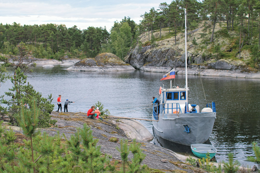[23.10.2019] Снявшись с Хауккасаари, мы пошли к месту следующей ночёвки - островам Палосаарет (с финского - Горелые острова). Встали на южном берегу самого северного из островов. Здесь очень удобно ставить палатки, от берега поднимаются несколько ярусов практически идеально ровной поверхности. Единственное, что некуда вбивать колышки - на каменной плите совсем нет грунта, только пара сантиметров мха. Ну да погода безветренная, палатка на дугах - колышки и не нужны. Кто-то сразу отправился рыбачить, кто-то готовить ужин, кто-то пилить дрова. Кэп тем временем собирает баню. Для бани место тоже очень удобное - ровный плоский камень у самой воды. Можно пока побродить вокруг лагеря, посмотреть, что тут есть красивого и интересного. Баня готова, ужин тоже. Сейчас поедим и будем париться, а потом нырять в Ладогу. На следующее утро я проснулась пораньше и пошла пройтись по берегу, пока все ещё спят. На отдельной скале рядом с нашим островом целая колония чаек. Голосят как ненормальные. И вечер