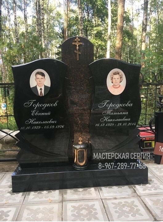 Гранитный памятник на заказ на два человека из комбинированного гранита двух цветов. Комбинированный памятник позволяет сочетать в себе несколько пород камней, что придает красоту и индивидуальность модели. Этот заказ мы изготовили из двух камней: черный гранит Габбро Диабаз ( Карелия) и темно-шоколадный Дымовский( Карелия). На одной единой фундаментальной гранитной подставке крепится три стелы: две боковые из черного гранита Габбро Диабаз (Карелия), на которых оформлены портреты с надписями и центральная темно-шоколадная стела из Дымовского гранита. На центральной стеле расположен бронзовый крест с распятием , а внизу стоит лампада для свечи. Модель полностью полированная со всех сторон, что придает памятнику зеркальную поверхность и защиту. Наша Мастерская предлагает предварительные макеты на памятники, портреты и надписи, где есть возможность сделать поправки, и после утверждения мы приступаем к изготовлению самого памятника. К тому же заказчик заранее может посмотреть как будет вы