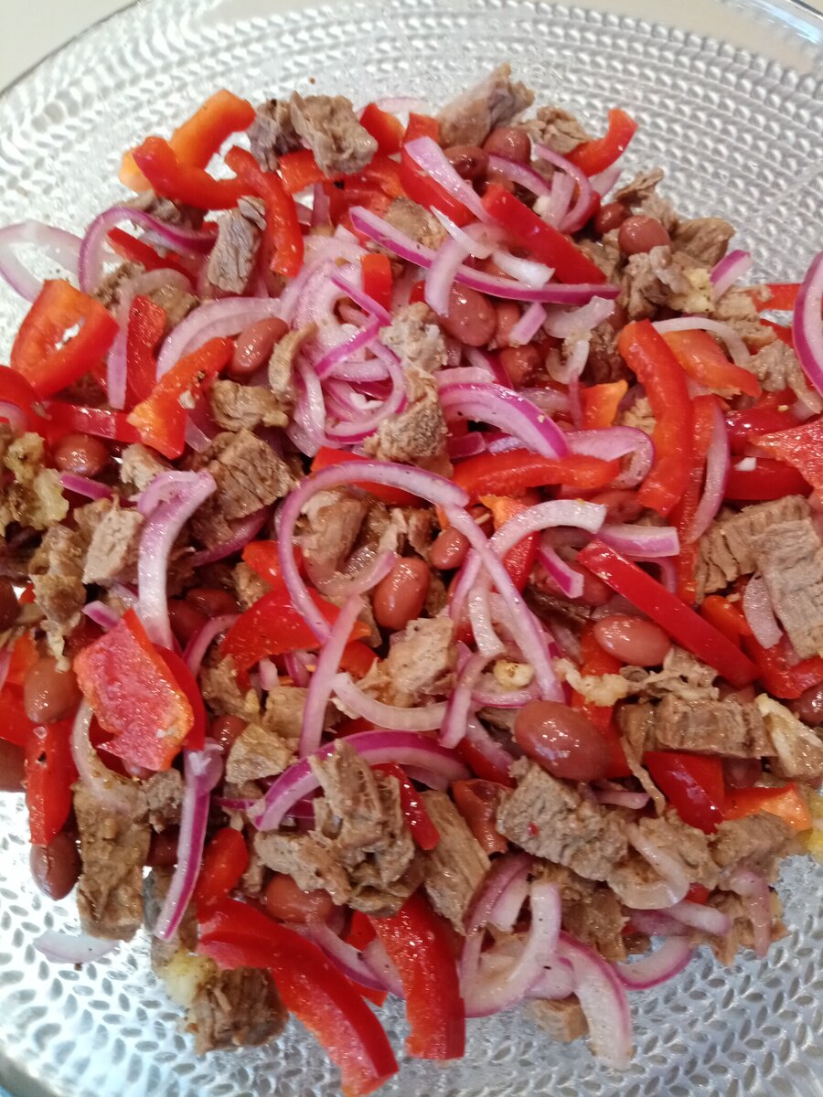 Нам необходимо: говядина отварная 250 граммов фасоль консервированная красная 1 банка перец болгарский 1 штука лук красный 1 штука чеснок 3 зубчика орехи грецкие 50 грамм уксус 9% 1 столовая ложка кинза сушеная 1 чайная ложка черный перец горошком, размолотый на мельнице 1/2 чайной ложки соль оливковое масло для заправки Говядину нарезать небольшими брусочками. Чеснок пропустить через пресс. Красный лук нарезать полукольцами, замариновать с уксусом. Болгарский перец очистить, разрезать на 4 части, четвертинки нарезать поперек небольшими полосками. Выложить в салатницу фасоль. Добавить измельченные грецкие орехи, соль, перец ,кинзу, чеснок, маринованный лук. Заправить оливковым маслом, перемешать. Заправлять салат специями я бы рекомендовала перед подачей на стол . Тогда специи звучат ярче. После того как салат настоится их аромат уже не такой выраженный. Приятного аппетита!