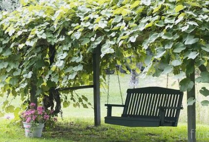 На моём участке растёт куст винограда, давно растёт и даже плодоносит. Но вот незадача – нет у него никакой опоры и лежит лоза на земле. Задумали мы сделать шпалеру для нашего винограда. Да не простую шпалеру, а с хитростью: чтоб не только растение могло на неё опираться, но и чтобы создавала эта шпалера тень в самом солнечном месте нашего участка. А в эту тень можно будет поставить лавочку и удобно там расположиться в жаркий денёк. Шпалера вместе с обвивающей ее лозой давно стала элементом ландшафтного дизайна участка, поэтому я стала собирать идеи таких конструкций-шпалер. Нашла очень много красивого и необычного. Есть шпалеры в виде арок, зонтиков, есть в виде алькова или перголы. Скорее всего наша шпалера будет из металлической арматуры, сварной конструкцией, в которой будет продета проволока как опора для лозы. Для шпалер лучше всего использовать оцинкованную проволоку толщиной не менее 3-4 мм. Второй вариант – стальной или металлополимерный оцинкованный трос в ПВХ-оболочке. Прово