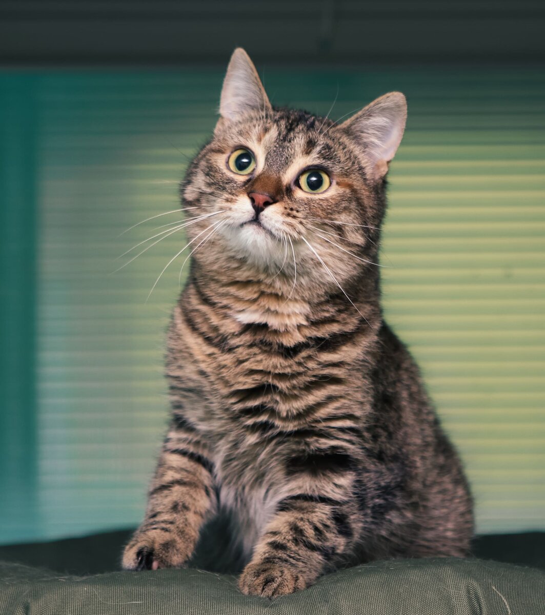 Мика – это молодая, полосатая и очень игривая кошка. Она всегда полна энергии, любит играть с мячиками и ловить мышку на удочке. Ее любимое занятие – это подкрадываться к незнакомым предметам и обнюхивать их.