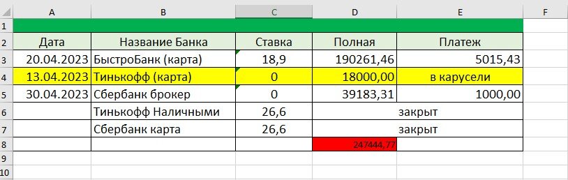 Сейчас готовила таблицу и мне показалось, что снова и снова топчусь на месте. Подняла свои старые статьи о долгах... Позади ломбарды и выкуп вещей, закрытие небольшого долга перед торговым центром, а еще приставы и отмена арестов. Такой непростой путь прошла и иду дальше. Задумала новую стратегию, "каруселька" - пополнять кредитную карту и с нее гасить долг досрочно перед БыстроБанком. Я только начинаю, тестирую, пробую. 01 апреля результат меня очень-очень порадовал. Сумма была на тот момент 5015,43 коп. Я ее хорошо запомнила. А общая картина такая. В марте я отправила платеж 5000, сверху 6000 (с карусели) и каждый вечер по 40 руб. (средне) с Дзена. Таким образом долг по ежемесячному платежу уменьшился на 500 руб. 😀 Продолжу дальше в том жу направлении.